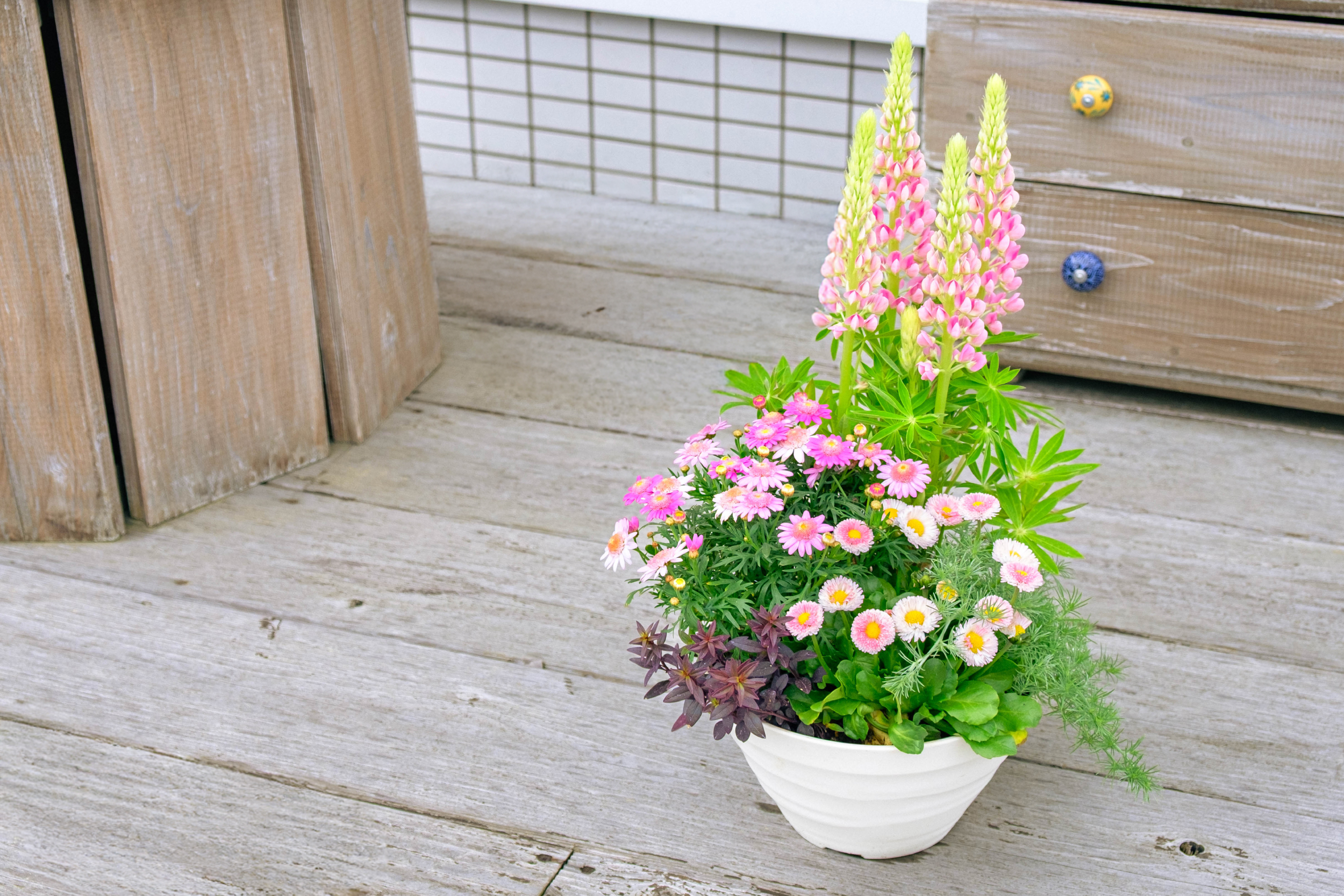 まっすぐに伸びる姿が印象的なルピナスのまわりを、軽やかな色の草花が彩り、春らしく調和します。