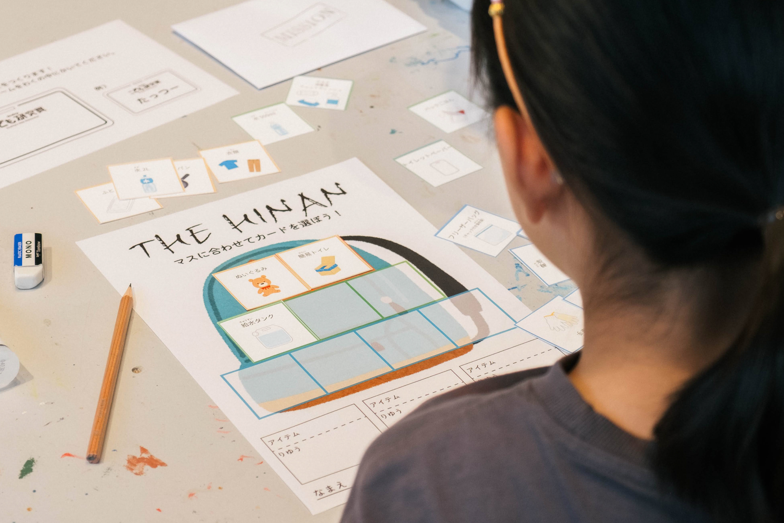 ホームセンターで販売している備蓄品カードの中から、自分や家族に必要なものを選び、防災リュックをつくるカードゲーム型ワークショップです。