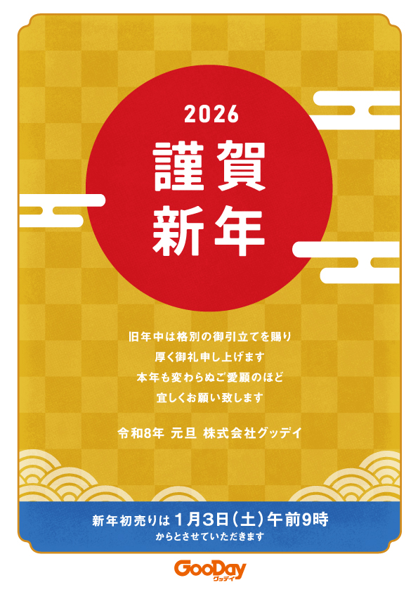 謹賀新年旧年中は格別の御引立てを賜り厚く御礼申し上げます本年も変わらぬご愛顧のほど宜しくお願い致します令和八年 元旦株式会社グッデイ※新年初売りは1月3日(土)は午前9時からとさせていただきます。(閉店時間は通常通り)